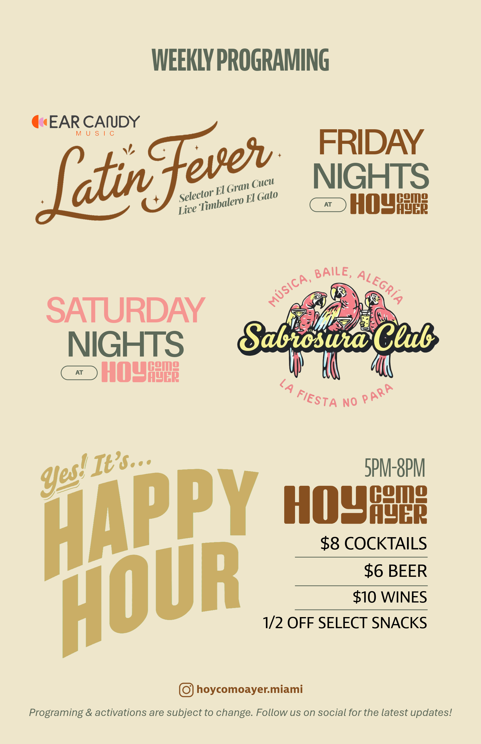 Upcoming events & Programing Jan 4 All day brunch Sunday, January 4, 2026 12:00 PM 6:00 PM Google Calendar ICS View Event → Jan 2 Latin Fever Friday, January 2, 2026 10:00 PM 11:59 PM Google Calendar ICS View Event → Dec 13 Latin Fever Saturday, December 13, 2025 9:00 PM 11:59 PM Google Calendar ICS View Event →